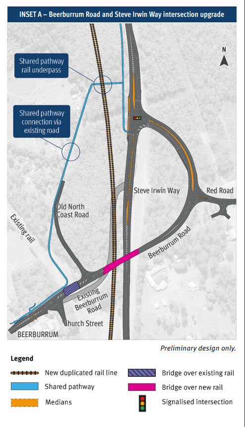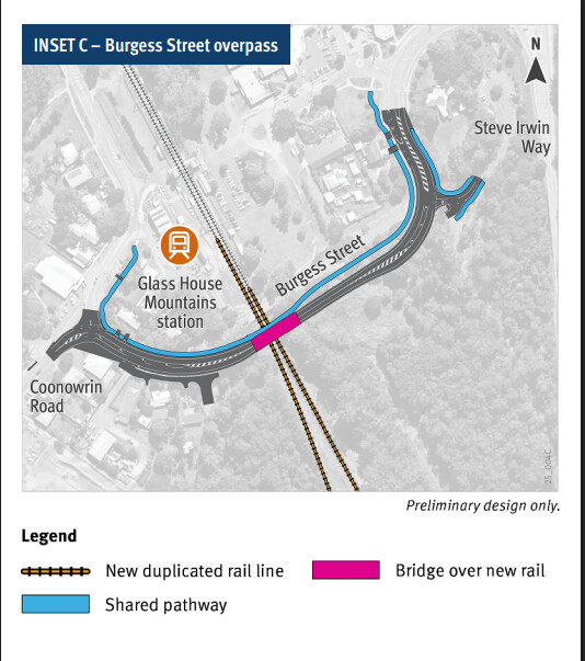 Basednon inset A, it looks like they could replace the existing rail alignment with a shared path under Beerburrum road based on the fact they are building a bridge over the existing rail (notice the sharp 90° turn on the shared path).