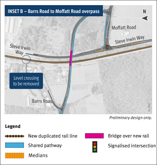 Replacement of the Barrs Road level crossing in Glass House Mountains with a new road overpass connecting Barrs Road to Moffatt Road.