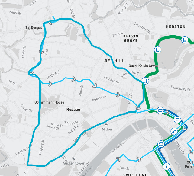 The Ashgrove City Glider would be rerouted onto Waterworks Rd, Jublee Terrace, and Milton Road rather than copying the 385 BUZ on Given and Latrobe Terraces. This would increase the coverage of high-frequency bus routes in the inner-western suburbs.