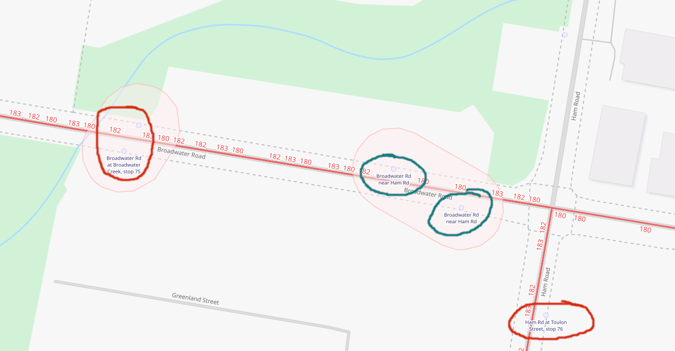 No idea why there are these stops for the 182 within spitting distance of the Broadwater Rd stop that’s also served by the 180. (Source: Openstreetmap)