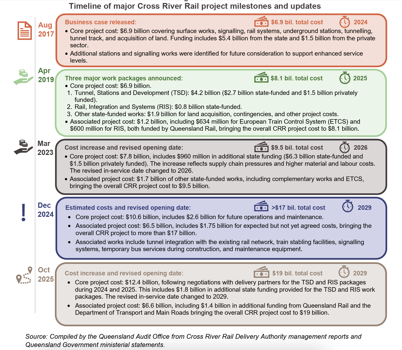 I read through the QAO report the other day after it was posted and I think the brevity of it does come with some loss of clarity. It would be quite a task to try and cross reference the individual projects that are in CRRDA’s authority, particularly noting that the QTRIP is currently listing some projects as vaguely CRR additional works, and also listing projects that may or may not be core projects as delivered by CRRDA or delivered through a PPP arrangement. This is on top of Blue Team’s new approach to QTRIP of not actually assigning a budget amount publicly until after procurement is finalised.