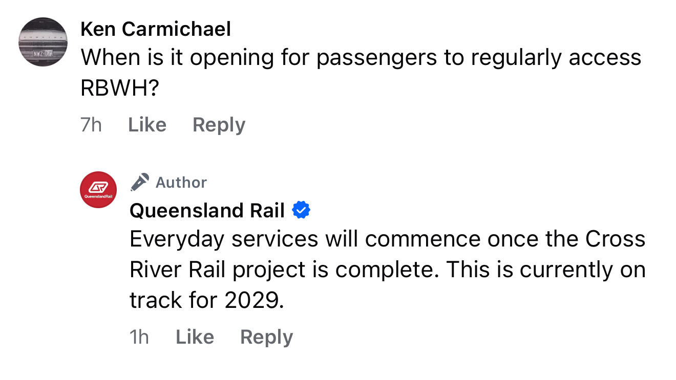 Unfortunately, the Queensland Rail Facebook page are also using the Governmentâs 2029 claim in the comments of their post on the station opening.