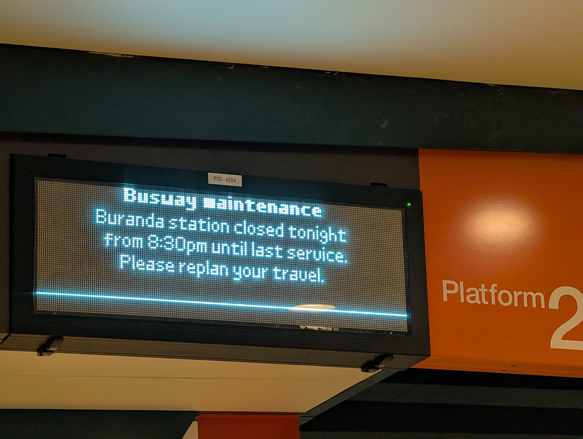 “This is the busway operations… [inaudible]… customers at Buranda busway station please head back upstairs. Alternative stops are being arranged. All buses will be driving around the station which is now closed for maintenance works. Thank-you.”