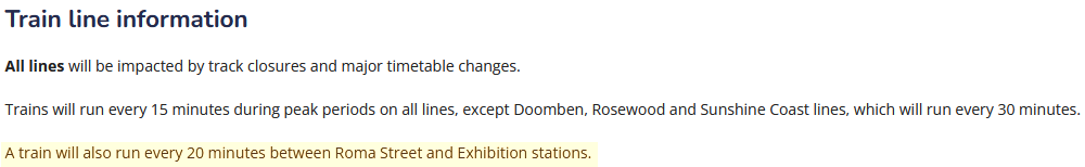A train will also run every 20 minutes between Roma Street and Exhibition stations.