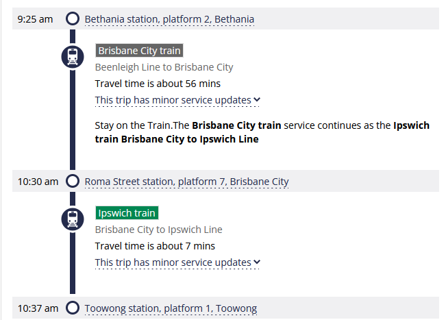 A slightly strange journey plan for tomorrow. The service notice says trains are travelling via Exhibition, yet somehow the train from Beenleigh is continuing to Ipswich? I understand there’s no Ferny Grove service, but I would’ve thoughts train from Beenleigh would terminate at Roma St and turn around there. Apparently trains from Caboolture are terminating at Roma St. The map makes it looks like the northern lines are continuing to the southern lines via Exhibition, but I guess that’s not practically possible unless they either bypass or turn around at Roma St anyway.