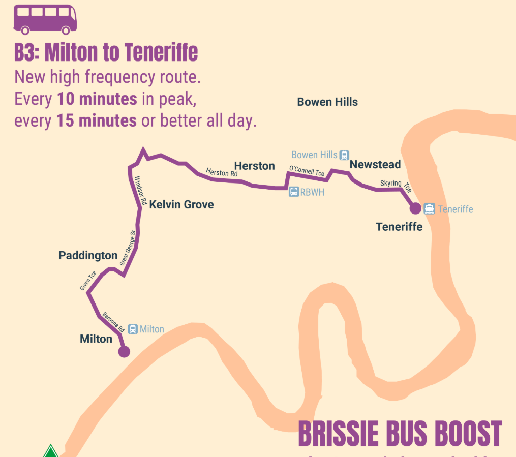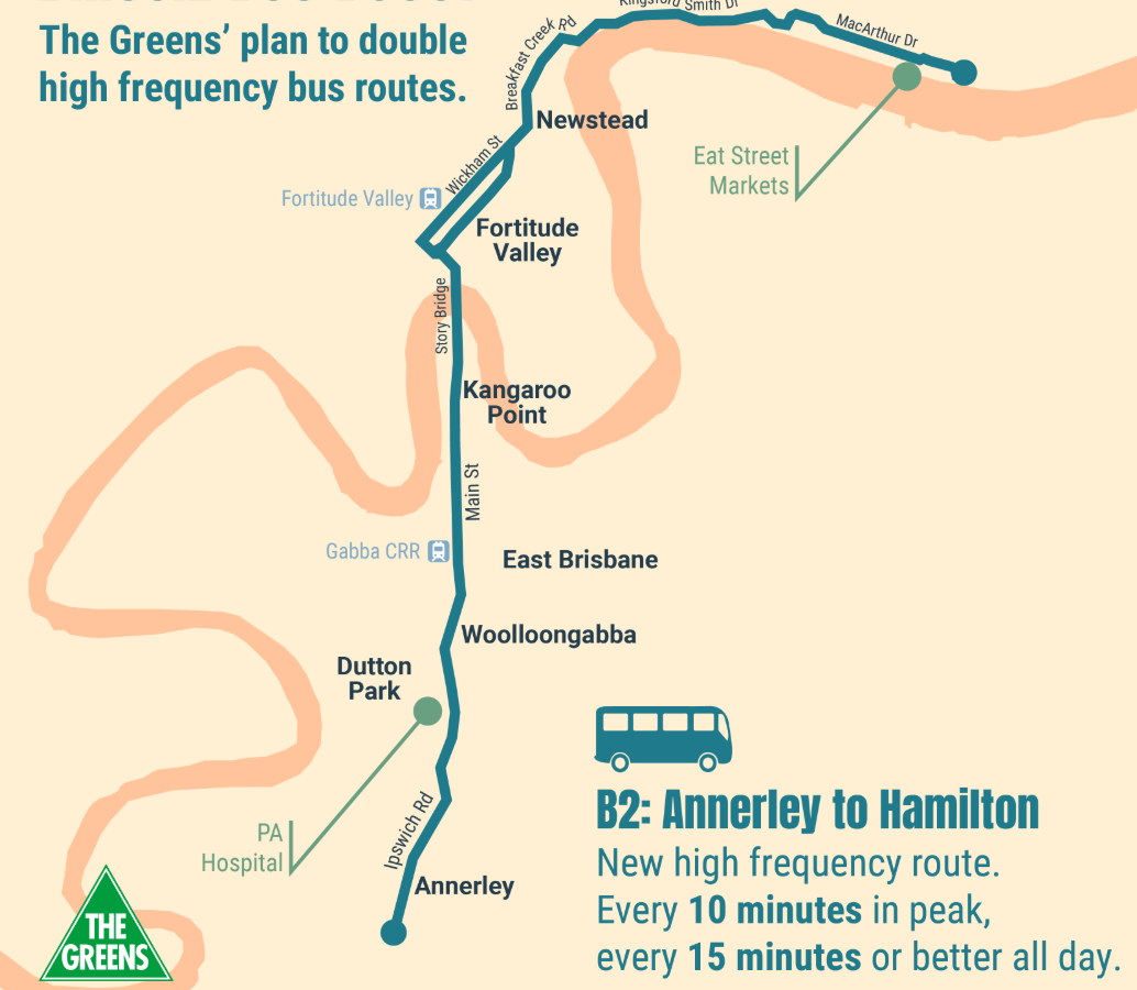 All I’m going to say is that the Green’s had a more effective, and bolder vision of overhauling Brisbane’s bus network than the RACQ’s vision (seen above). And that would’ve been through very helpful cross-town routes.