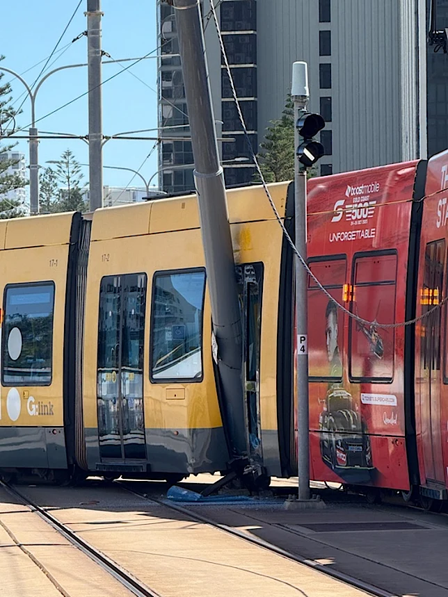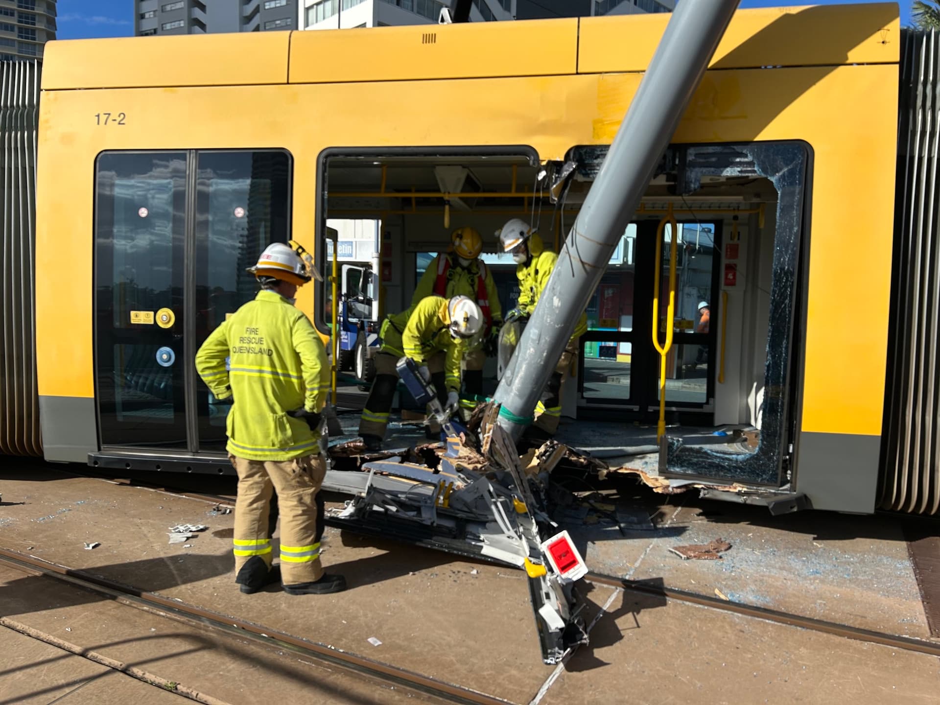 The Queensland Fire Department Facebook page have posted regarding their work in extracting the power pole from the tram, including photos showing some of the extent of the damage.