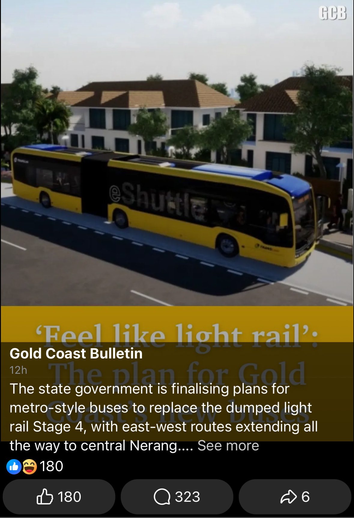 The Light rail is literally at Burleigh. And then you have the Gold Coast Rail line at Varsity Lakes. Whilst it would cost more, it would certainly be much better value for money if we revived those two extensions instead of continuing our weird obsession with fancy buses and slapping them with Metro stickers.