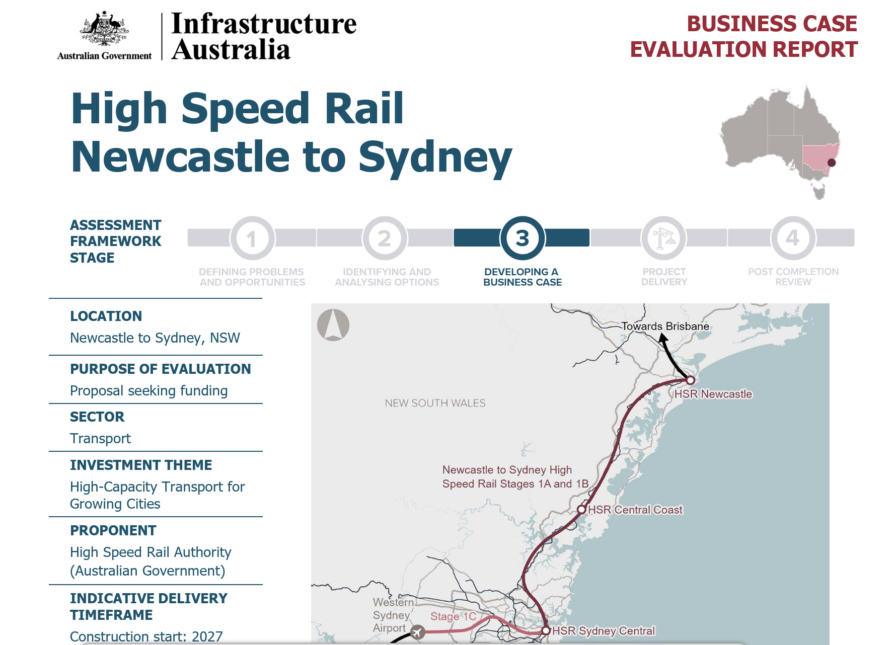 The Stage 3 Evaluation for the Sydney-Newcastle HSR was released by Infrastructure Australia today.