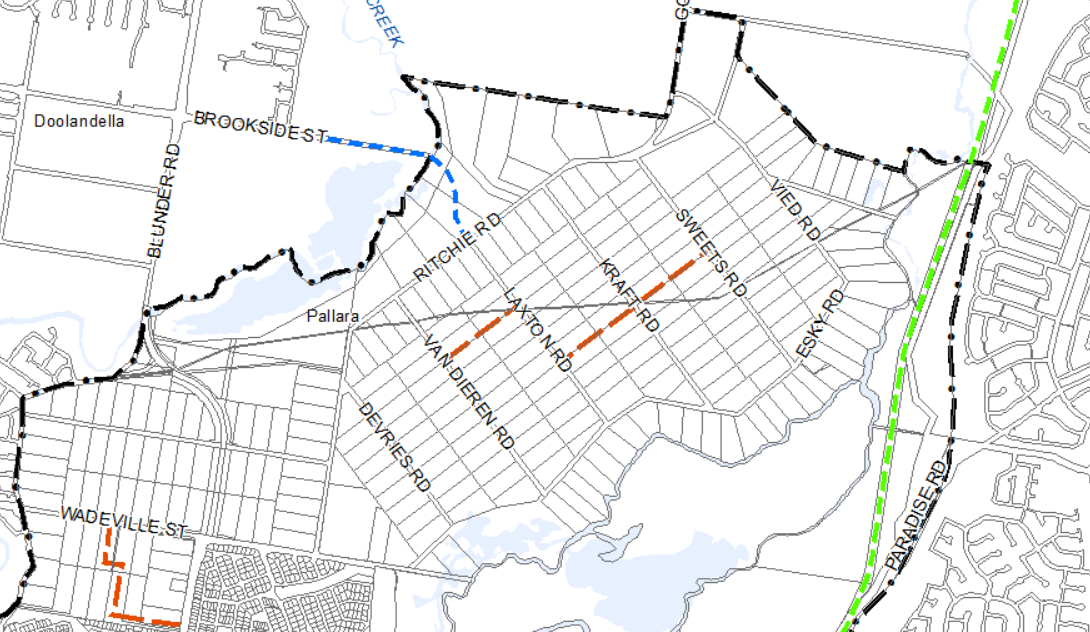 So the neighbourhood plan had two new local roads, one from Van Dieren to Laxton, and one from Laxton to Sweets (crossing Kraft). The Van Dieren to Laxton is built (Prominence St) and the portion from Laxton to Kraft is built (Fernando Street).
