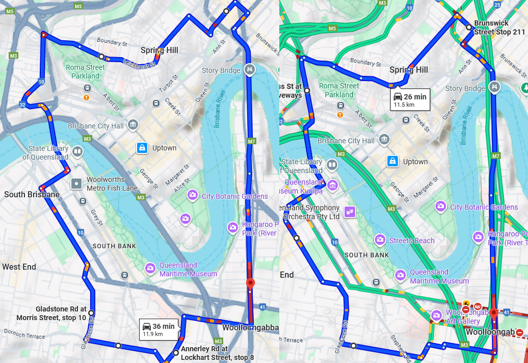 I personally prefer the via Spring Hill version, as I feel that the via Kelvin Grove route could be heavily impacted by traffic during peak periods, and the “Spring Hill Loop” really doesn’t cover that much of Spring Hill IMO. That said, I wonder whether a better alternative to using St Pauls Terrace, would be to run it down Water Street instead. Turn left out of Water Street > Boundary Street > Leichardt Street.