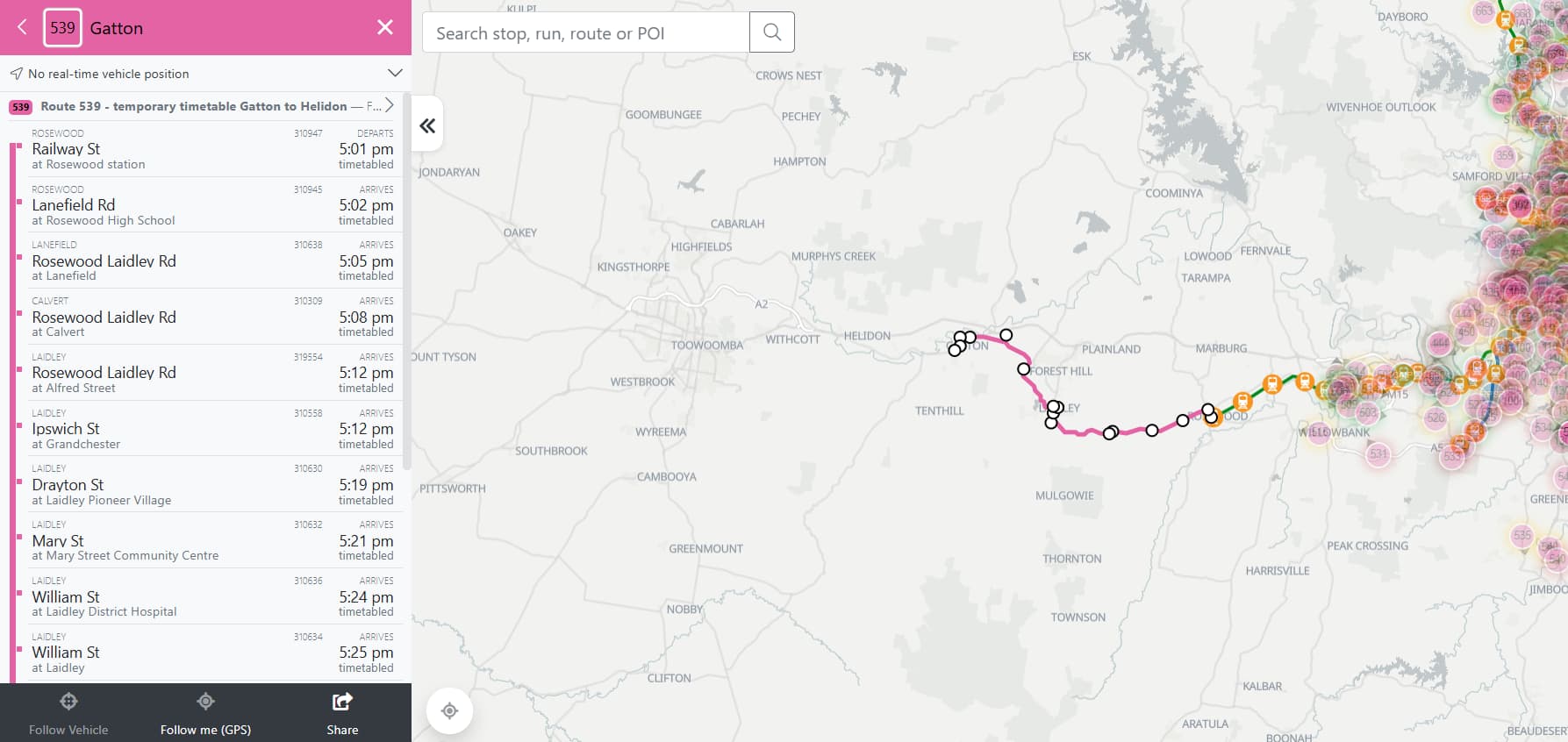 Iâd think a limited stops coach service from Ipswich to Toowoomba (call it the Route 538) could do, stopping in at Plainland, Gatton with selected services diverting into UQ Gatton and Helidon.