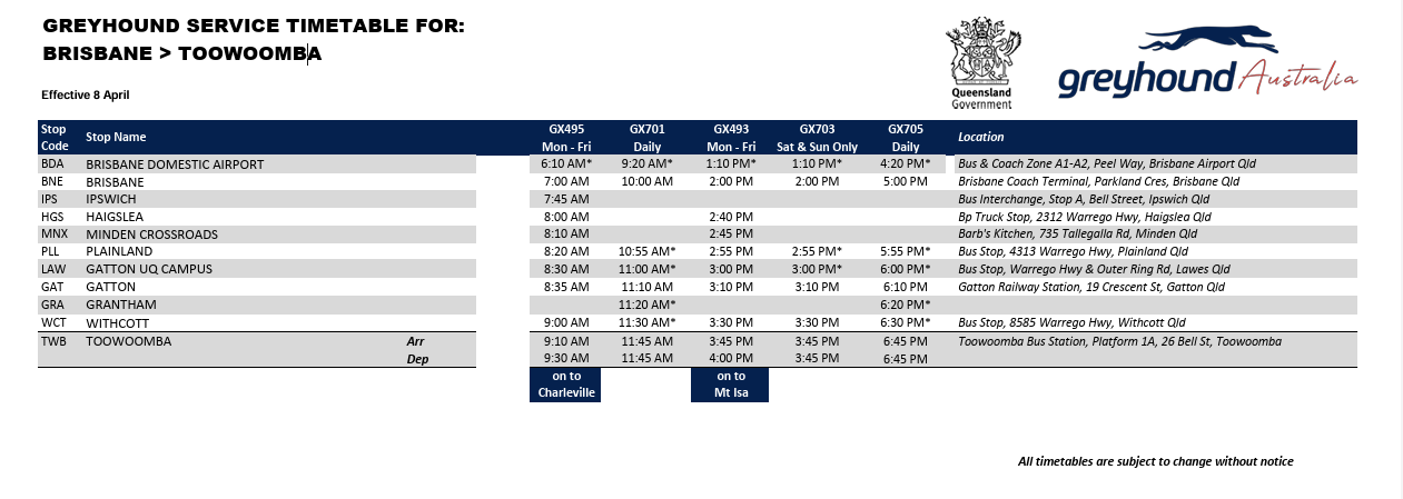 Greyhound Timetable https://documents.greyhound.com.au/common/timetables/Brisbane-Toowoomba.pdf