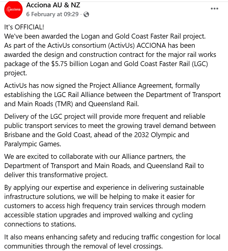 The work is being delivered by the ActivUs Alliance, which comprises UGL, Acciona, CPB Contractors, SMEC and WSP, in partnership with the Department of Transport and Main Roads and Queensland Rail.