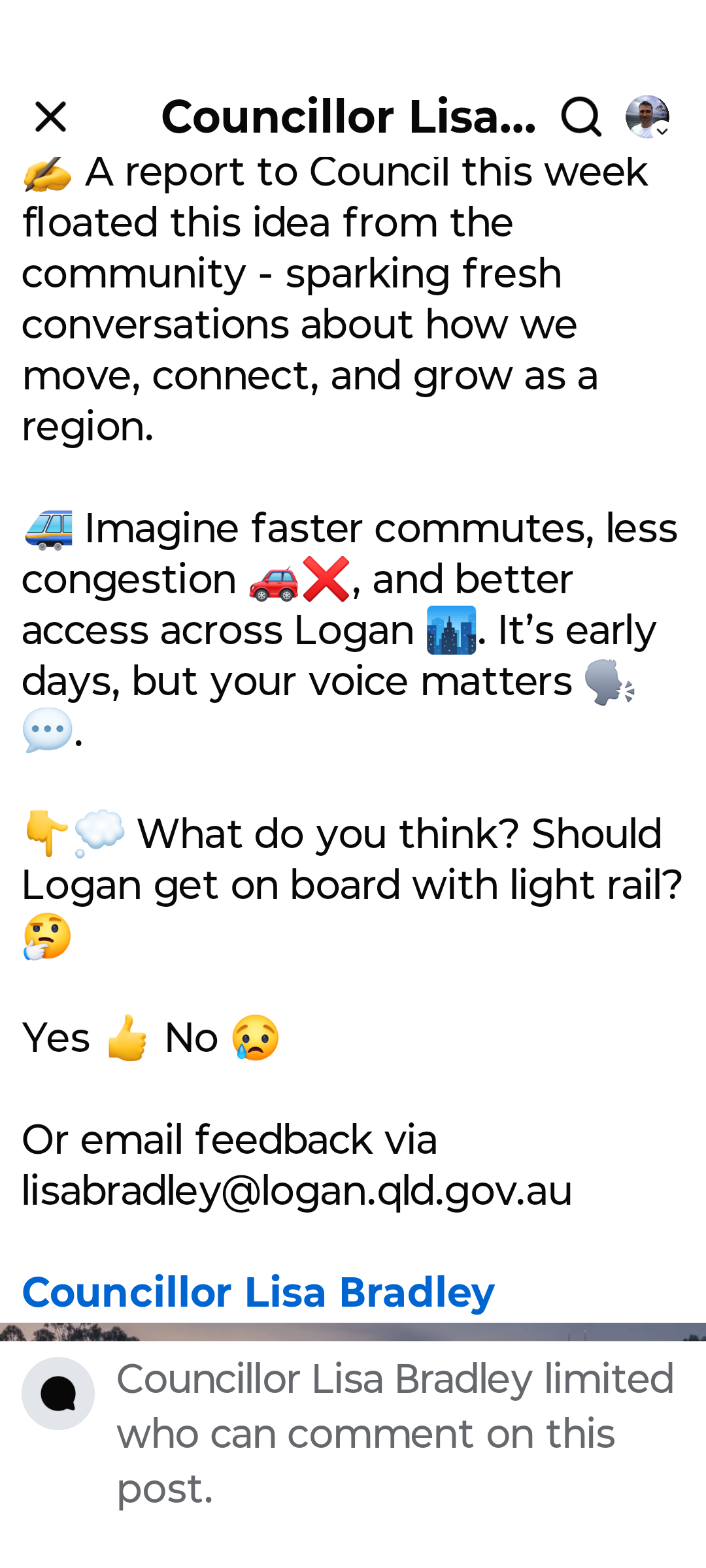 But being a PT foamer online is fine, at the end of the day itâs harmless. Itâs different to put up an unrealistic idea as an elected politician, because that sets higher public expectations, often followed by disappointment and eventually cynicism over PT infrastructure proposals. So I think it was a bit irresponsible for the councillor to float this idea and only allow a yes/no response through reactions instead of letting people air detailed feedback. Particularly for a non-BCC councillor, as no other council would ever have the funds to pay a large percentage of the construction cost themselves. Itâs easy to ask people if they want big money projects when itâs not your government thatâll be paying for it.