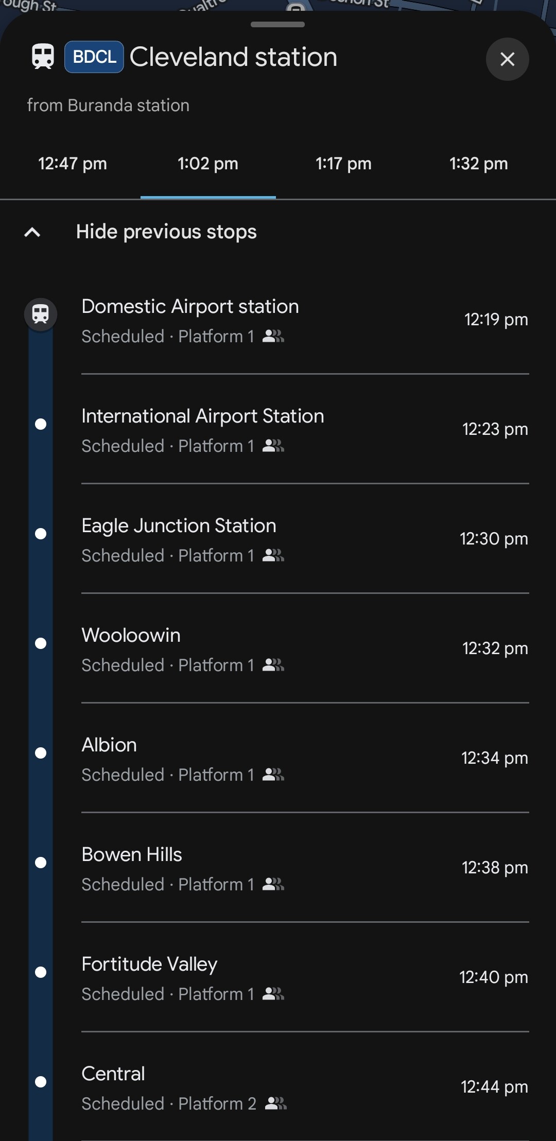 Therefore, I believe that the Cannon Hill terminators are providing the base 30 minute frquency for the Airport line and that the Cleveland terminators are being used for the additional 15 minute frequency infills when the Airport line has an increased frequency.