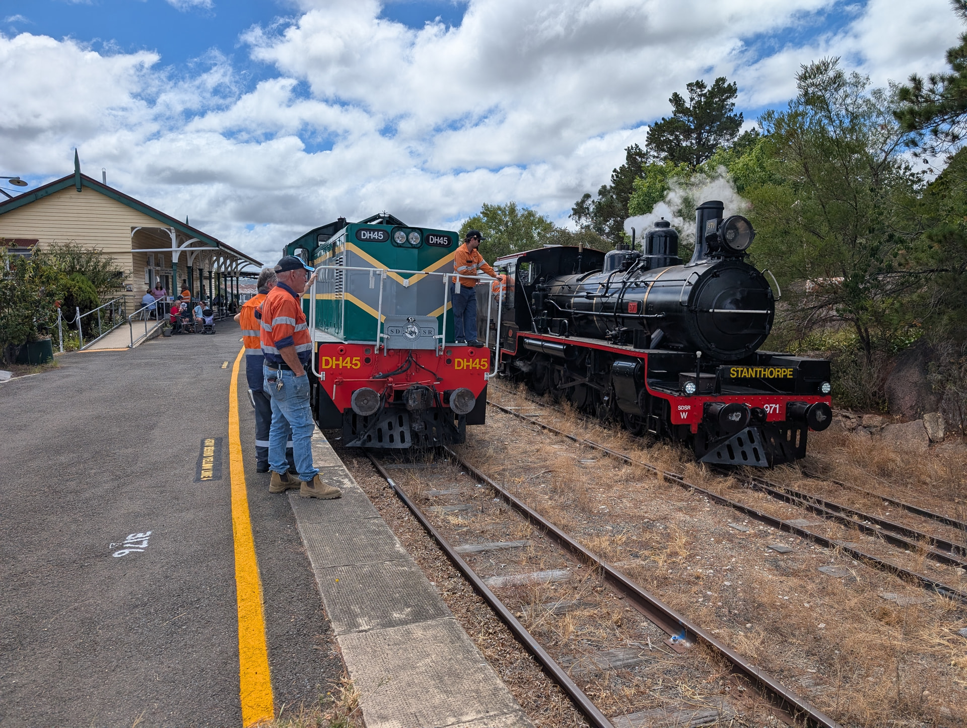 Southern Downs Steam Railway rolling stock family photo at Stanthorpe. DownsSteam from Toowoomba were supposed to join us with their 2000 class railmotor today, but they set it on fire a week ago on a tour, so itâs out of action for a while..