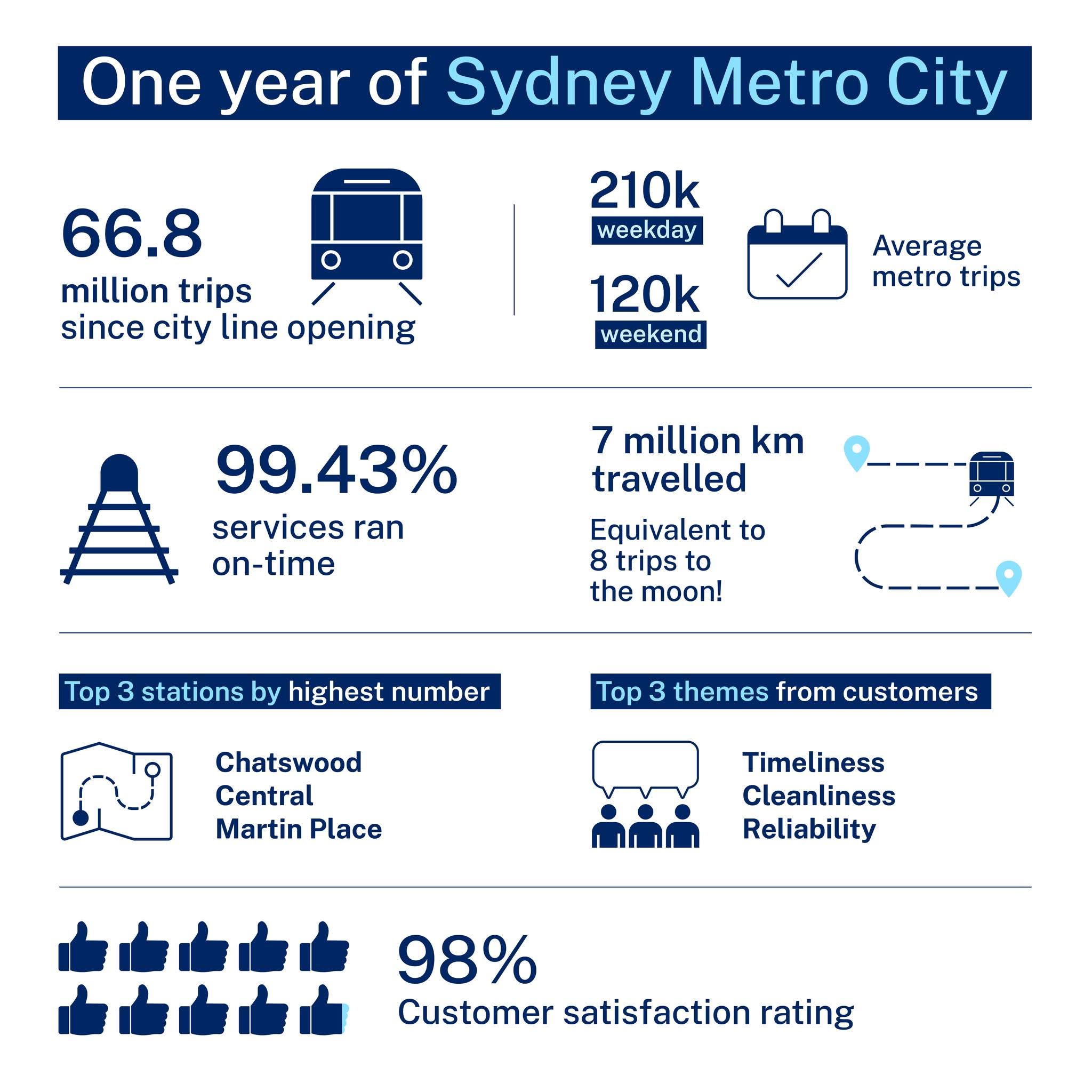 This week marks one year since the opening of Sydney Metro City, with more than 66.8 million journeys taken on metro services stretching from Sydney’s northwest, under the CBD and out to Sydenham in Sydney’s south.