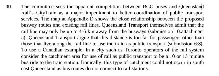 This committee considers transport planning for the future of south east Queensland an extremely important issue. Evidence before the committee clearly shows that if residents do not reduce car travel and adopt public transport the region will disappear under a maze of freeways and overpasses and choking smog. Brisbane may well become another Los Angeles. For this reason, the committee applauds Queensland Transportβs attempts to do something to increase public transport usage and reduce the use of motor cars.