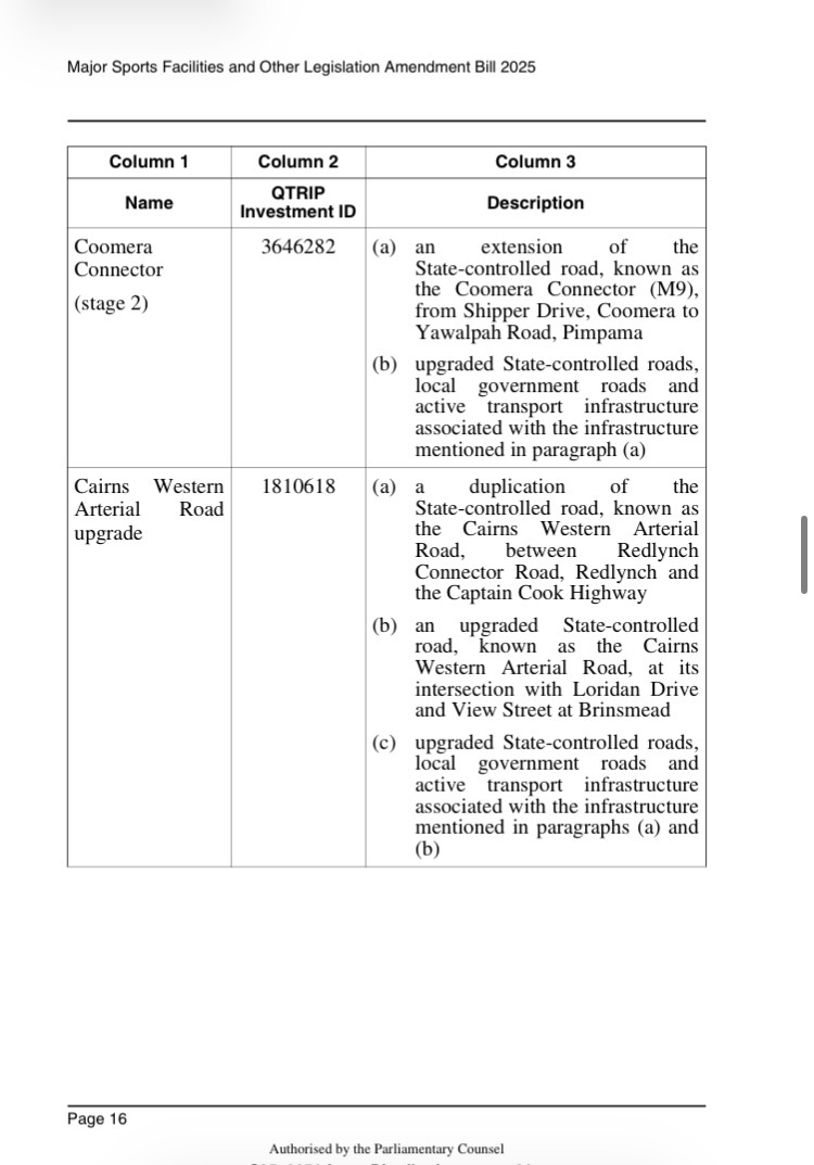 This is the list of four transport projects which have been inserted in the BOPGA Act which as others have said overrides a long list of state legislation, including environmental and cultural heritage laws. The amendments passed 12 Feb 2026.