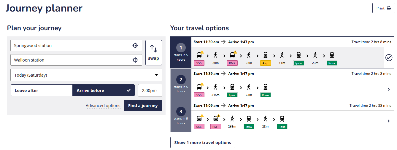 Journey planning has been greatly improved, although the ânext departuresâ board for a specific stop/station seems to have been retained from the old version and is still a dogâs breakfast. Apparently the NCL rail bus (649) leaves from âPlatform 100â from my station, and the 12:52pm Nambour train is still showing service updates from a delayed 9am service running in the other direction.