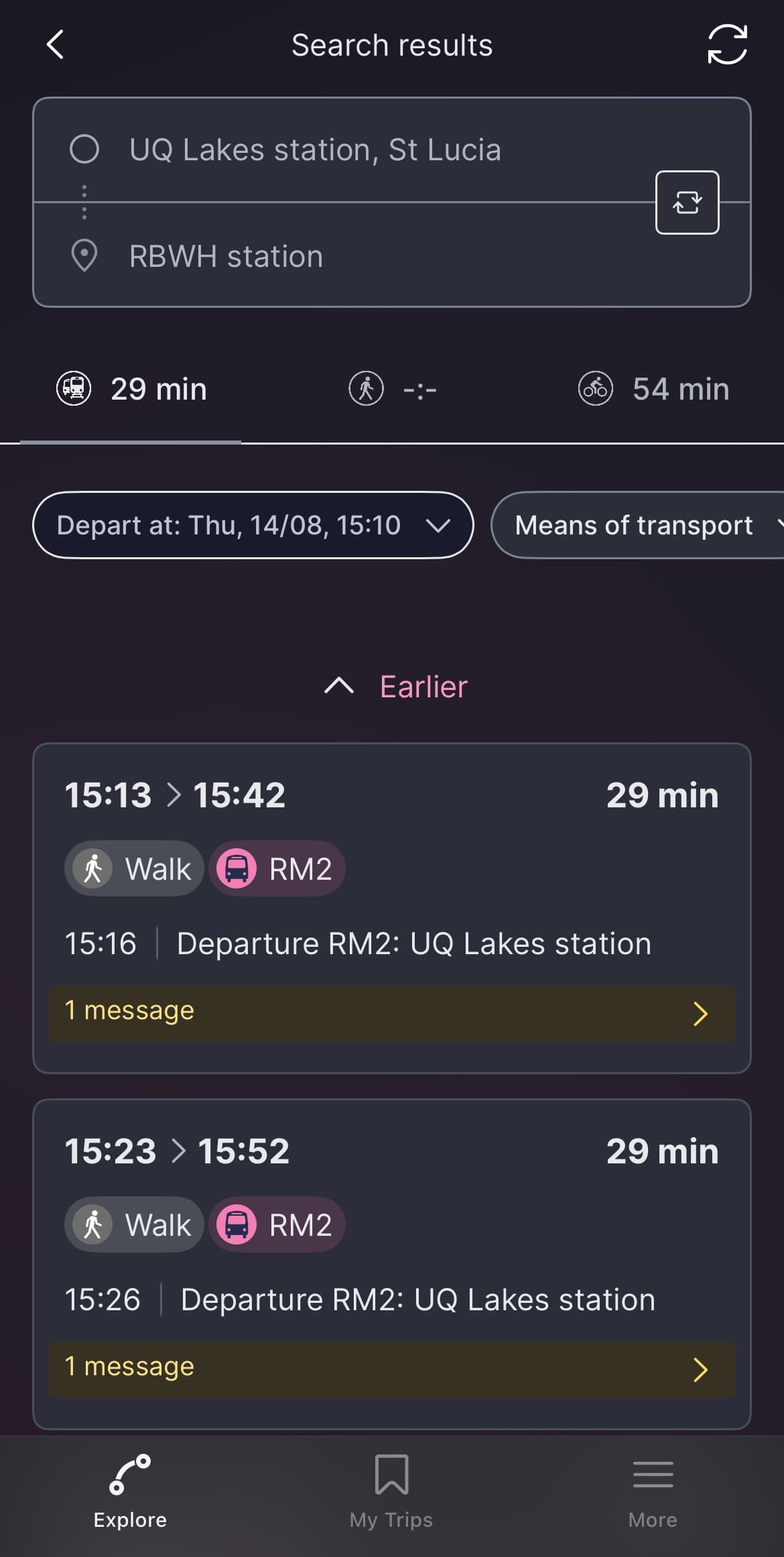 While under the Journey Planner, in the initial options it is listed as a Message (all service updates are listed as a message - for these routes, the 1 Message here is regarding the opening of Rochedale Station - there are no cancellations showing for these services).